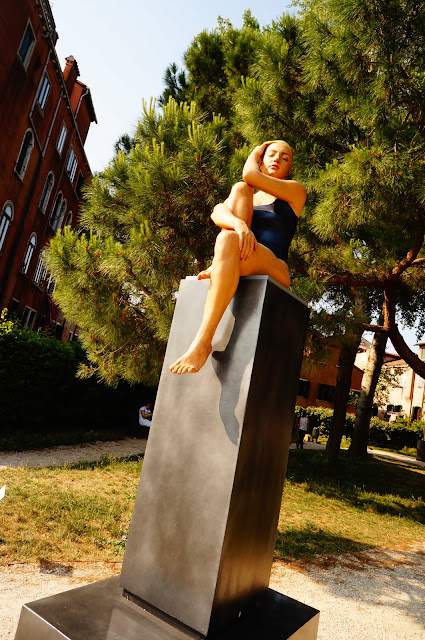 В этом году в Венецию нам посчастливилось попасть во время проведения легендарного форума искусства, который известен как Венецианская биеннале. Поэтому удалось посмотреть на множество экспонатов, скульптур, увидеть примеры современного искусства и так далее. Вот, к примеру, изваяния совершенно неотличимые от живых людей. Оксана вовсе думала, что они и правда живые, просто не двигаются.